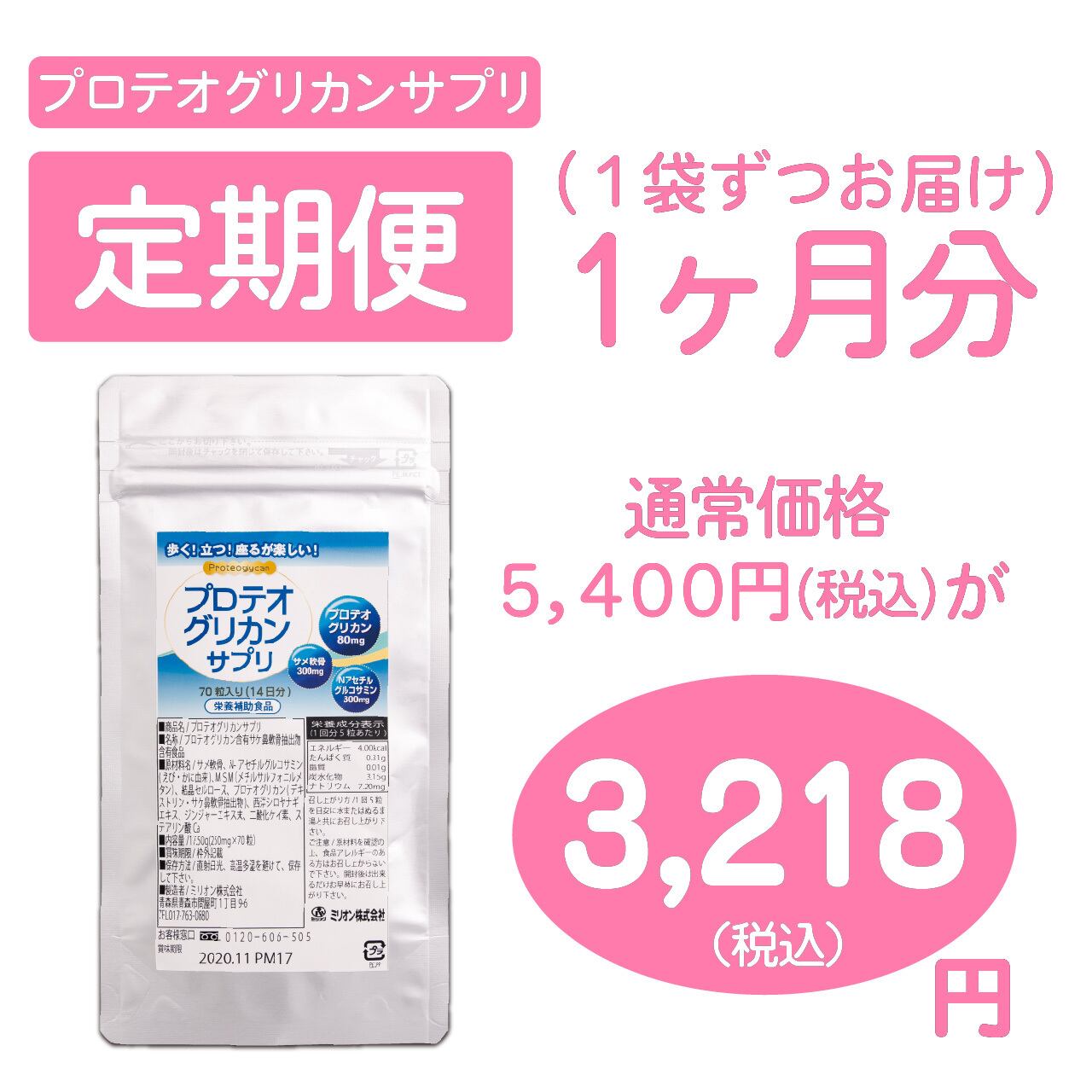新素材『プロテオグリカン』を贅沢に16mgを配合しましたサプリメントです。