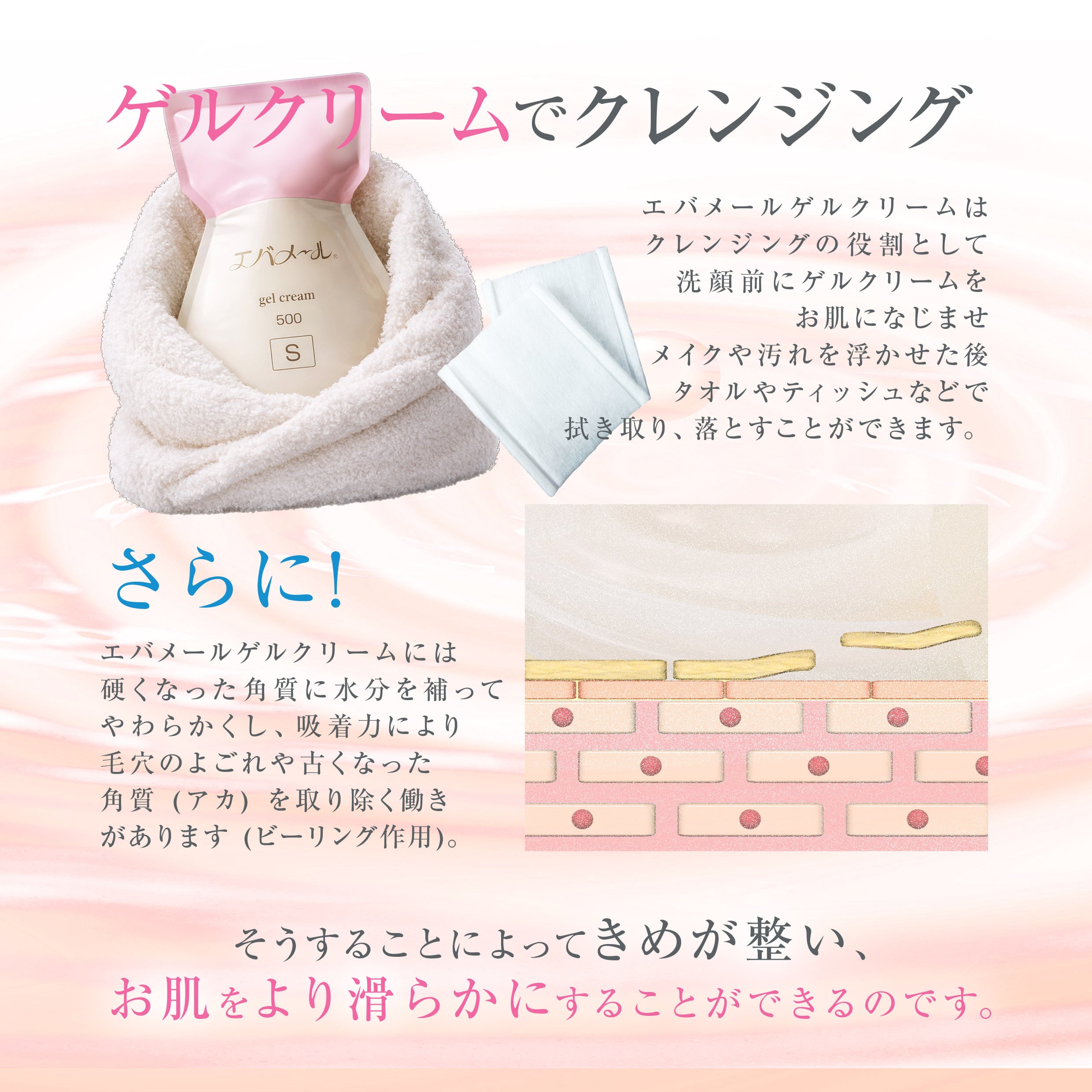 ゲルクリームをたっぷりとお肌になじませ、10分〜15分待ち、乾きかけの状態で軽くなでてください。古い角質がゲルの成分に絡まって出てきます。強くこすり過ぎないようにしてください。※週に1回〜2回が目安です。